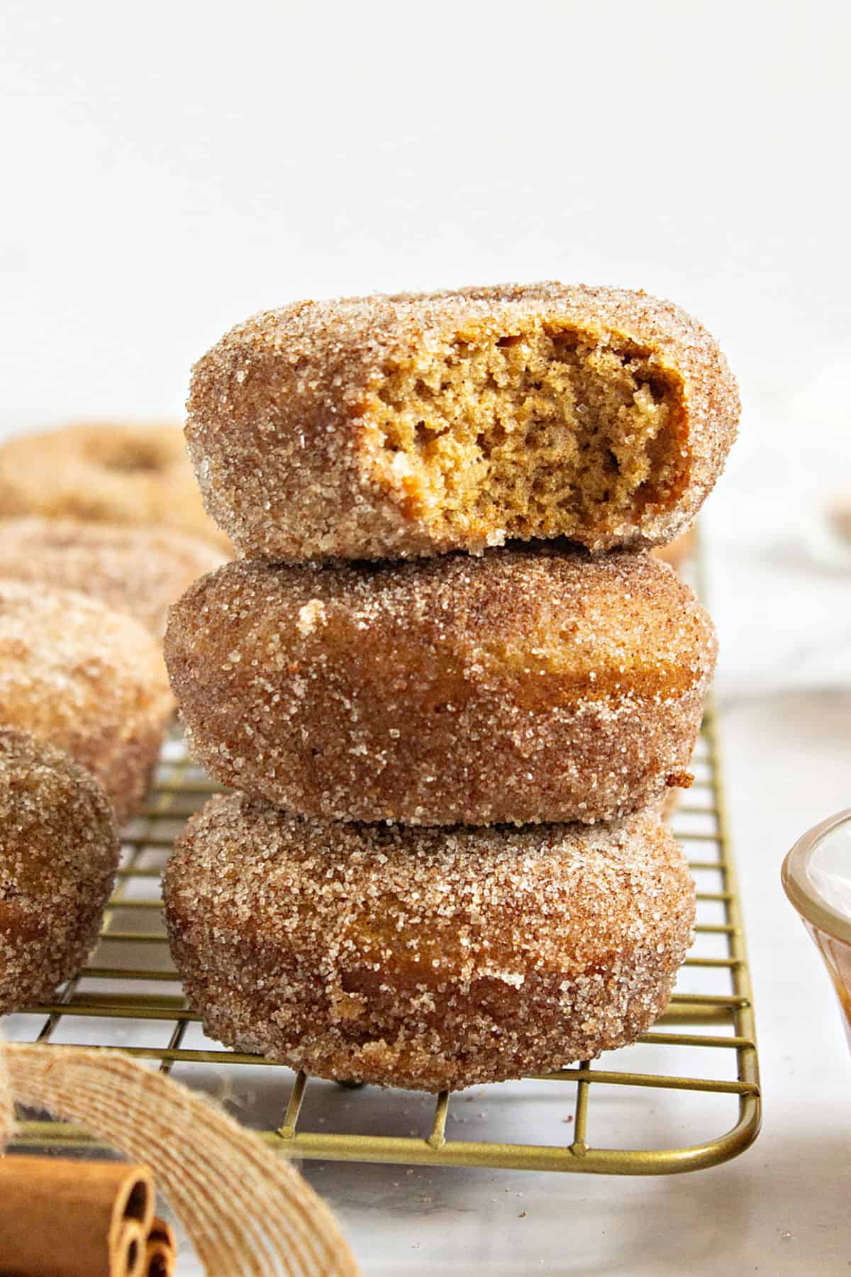 Don't overbake them! This is key for softness and a moist crumb. Check early because baked donuts go from done to dry fast. They should spring back lightly when touched. If they bake too long, they lose their tenderness.