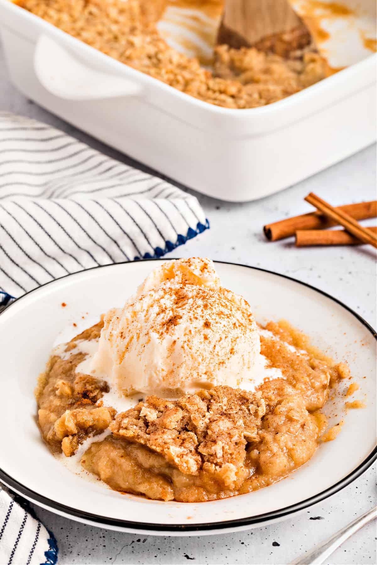 - Serve warm or at room temperature, with vanilla ice cream, cinnamon ice cream, or whipped cream and a dusting of cinnamon or drizzle of caramel sauce.