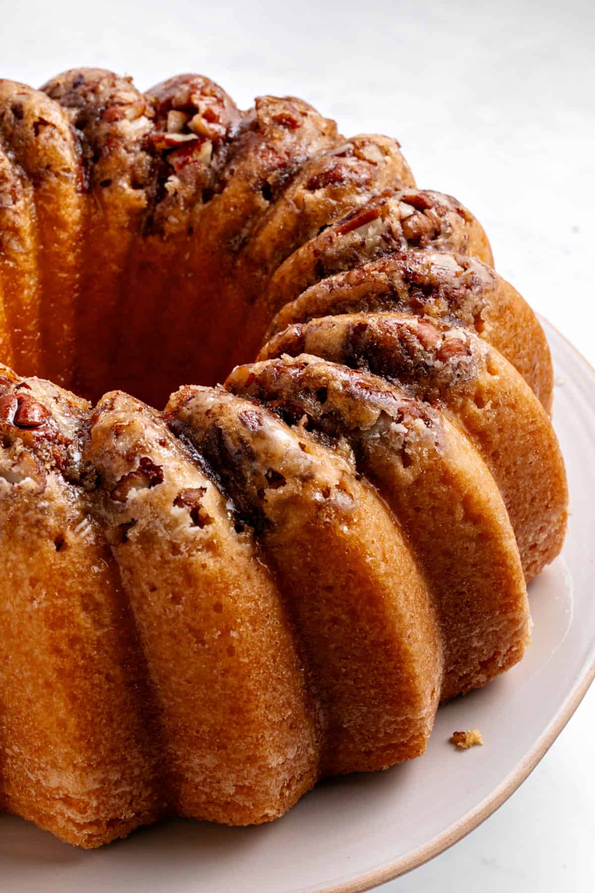 The pecan layer is upside-down magic. You coat the bottom of the bundt pan with chopped pecans before the batter goes in. When the baked cake flips out, those pecans are on top, toasted and slightly caramelized from the pan butter. You can use walnuts or even almonds to get a similar crunchy texture.