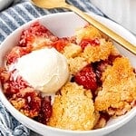 This 3-ingredient fruit dessert is a vintage classic with a layer of canned pie filling and a biscuit topping made with cake mix and butter. It's one of the most popular recipes on this blog and has gone viral several times! It freezes well, and I give you two options for making the topping. I use the classic cherry and vanilla, but you can mix and match different fillings with cake flavors.