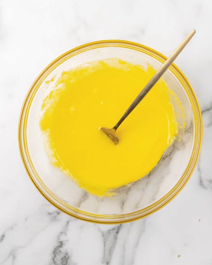 - Melt ⅓ cup unsalted butter in a medium saucepan over low heat. Before it boils, add the yolk mixture and cook over medium/low heat, stirring constantly, until the mix thickens, but do not let it boil.
