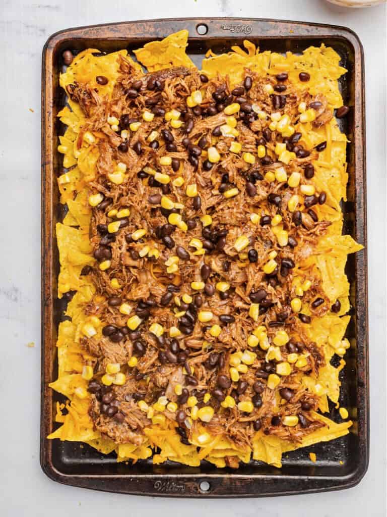 - Add ½ cup cooked black beans, ½ cup corn kernels and the pulled pork evenly over the chips. Top with the remaining ½ cup of cheddar cheese.