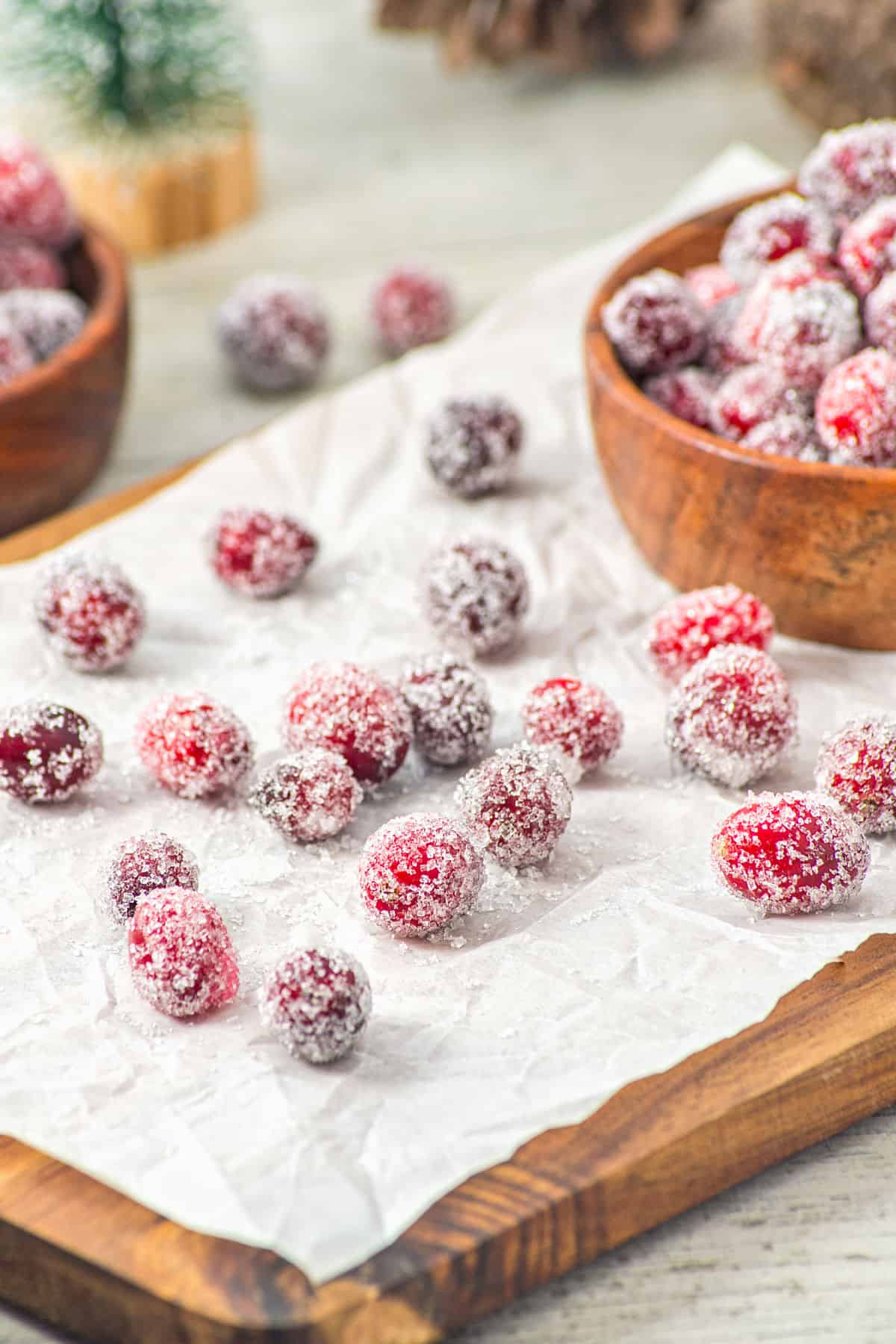 I recommend testing a few slightly sticky cranberries as they dry out to see how sticky or tacky they should be for the sugar to adhere well and be crisp. Roll twice if necessary.